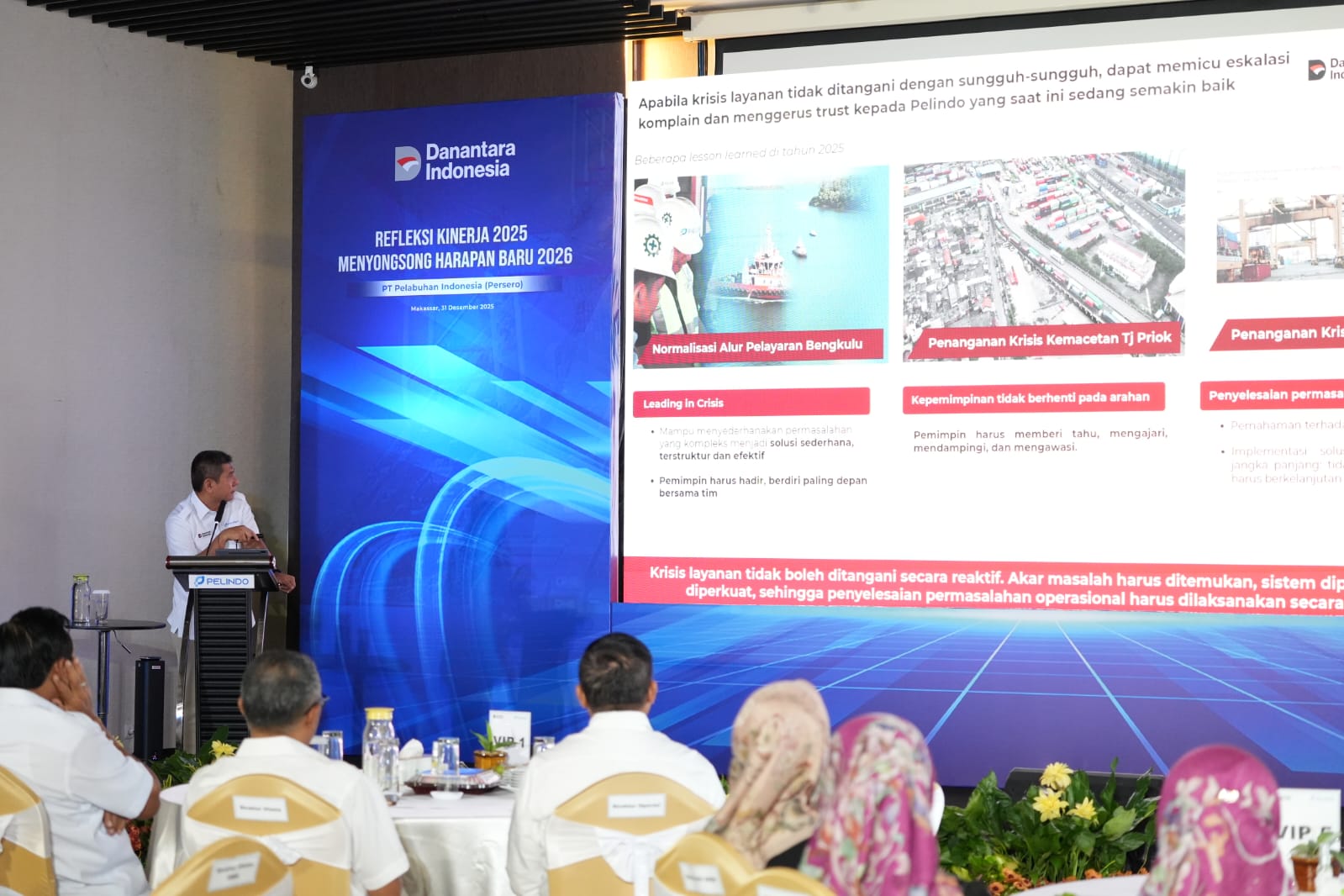 Direktur Utama Pelindo, Arif Suhartono, dalam CEO Direction menyampaikan bahwa tahun 2025 menjadi fase penting penguatan transformasi pascamerger, terutama pada standarisasi layanan, integrasi sistem, dan peningkatan kinerja operasional.